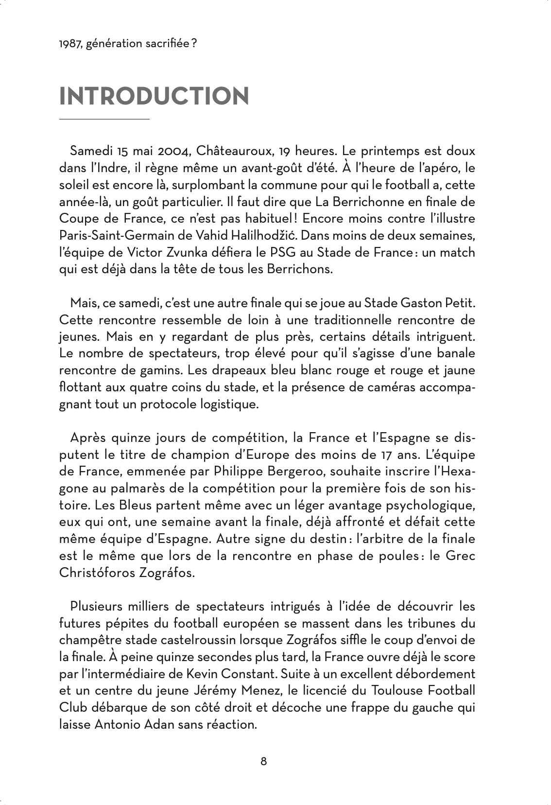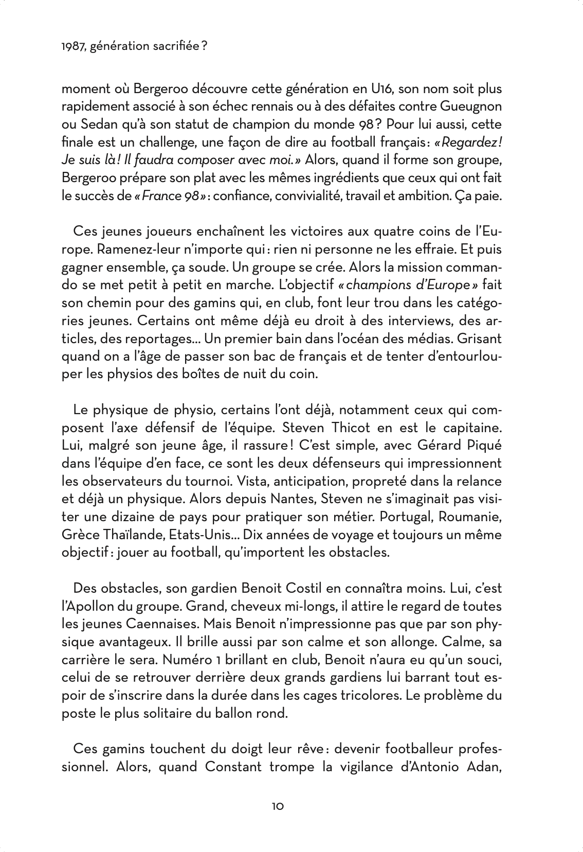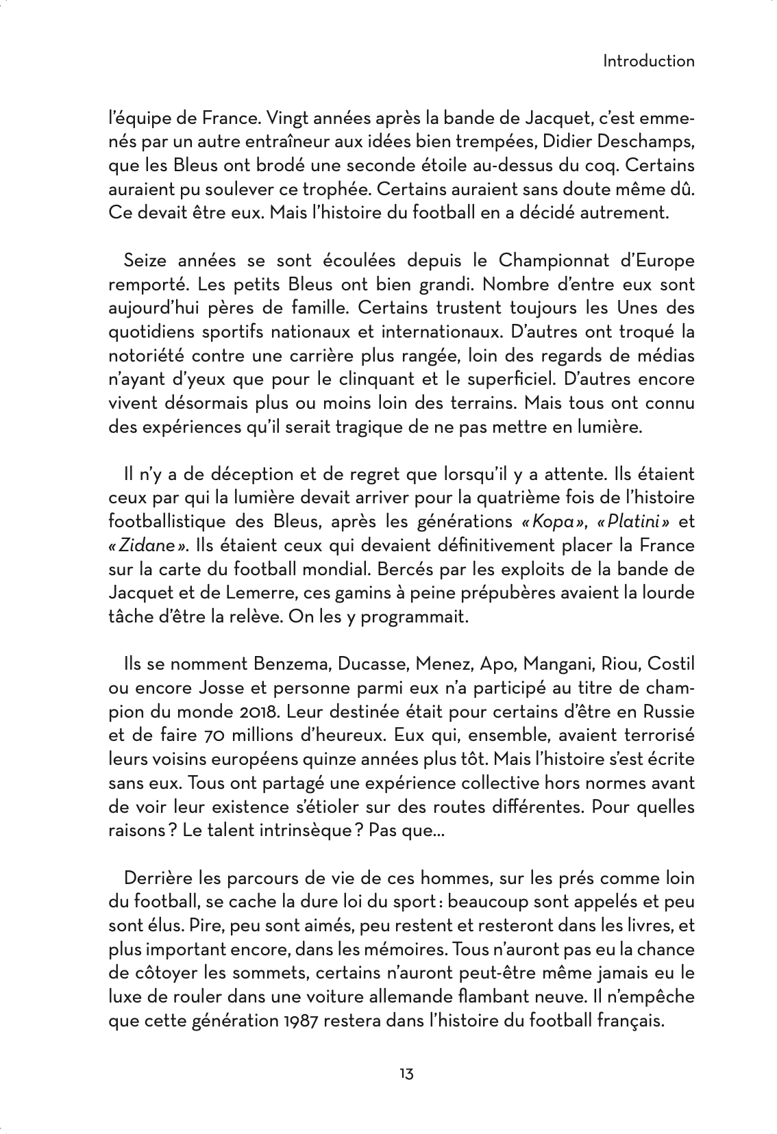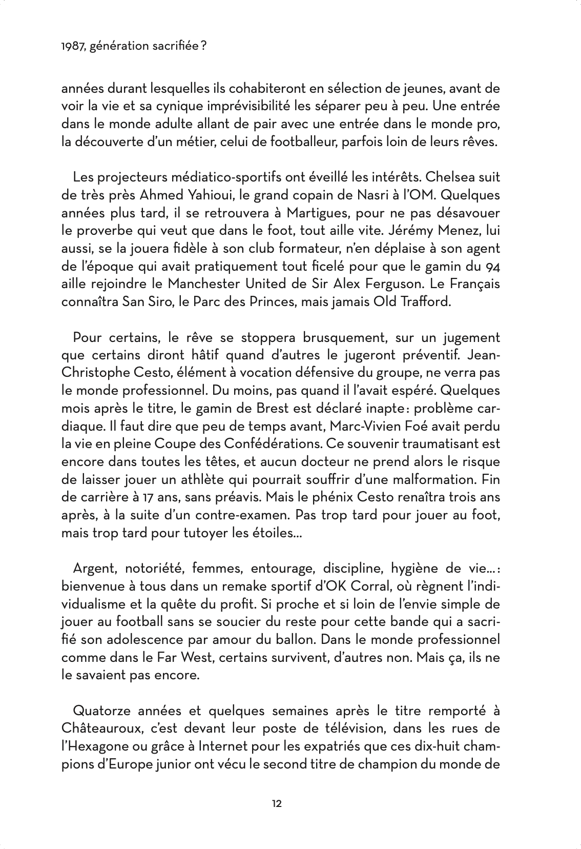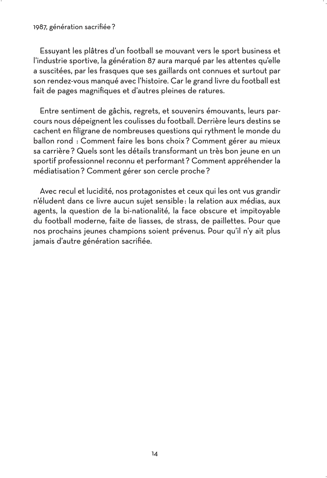 La Génération 87 était la plus talentueuse. Mais quinze années plus tard, les promesses n’ont pas été tenues. Au travers de cette galerie de portraits, ces sportifs et ceux qui les ont connus peignent le tableau d’un monde impitoyable : l’industrie footballistique. L’argent, l’entourage, les médias, les discriminations : aucun sujet n’est éludé. Un livre pour comprendre comment ces gamins sont pour la plupart passés de génies à parias.