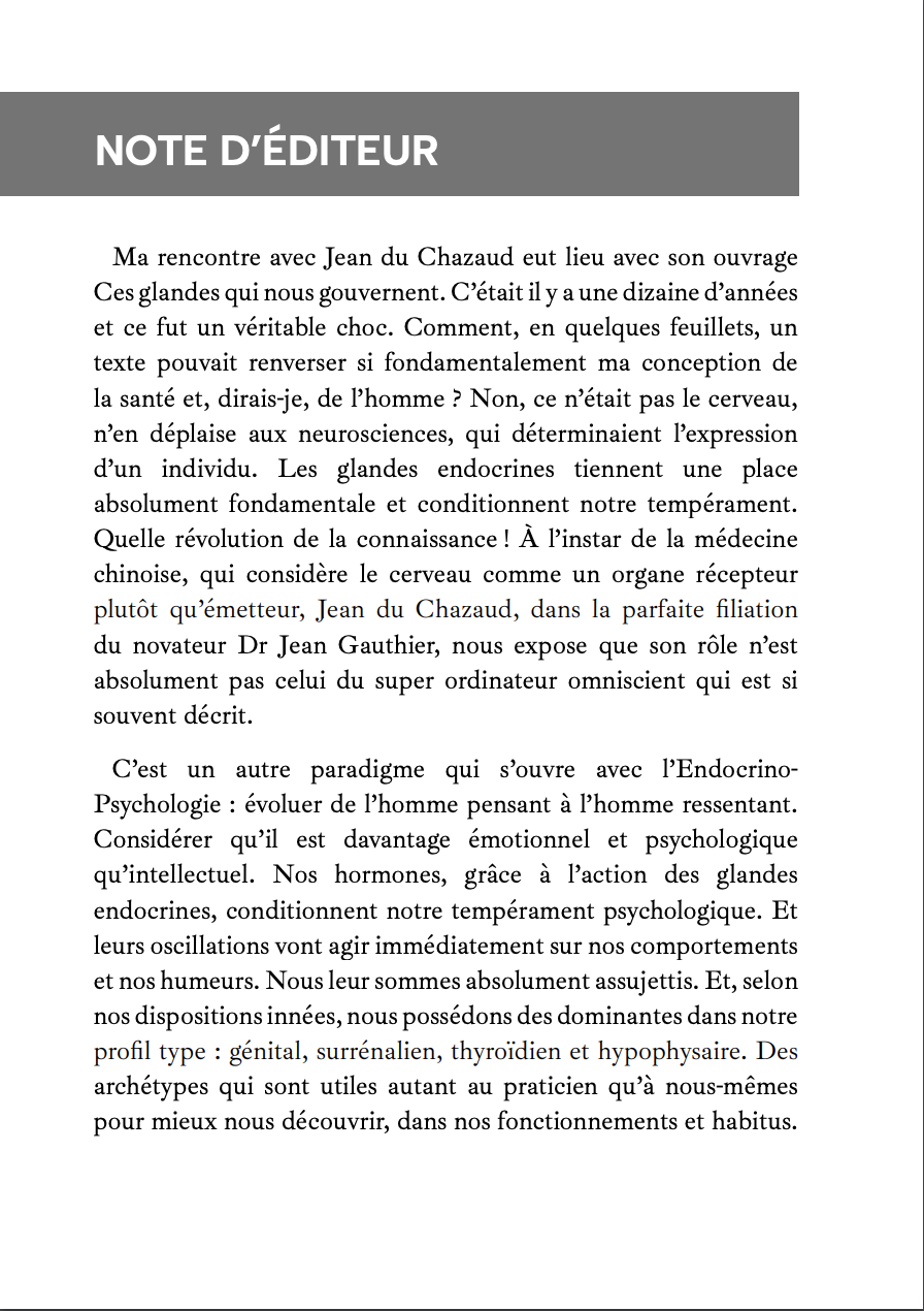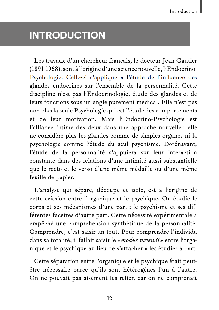 Ce livre se veut être l’ouvrage de référence de l’Endocrino-Psychologie, discipline nouvelle qui se fonde sur les travaux magistraux d’un savant hors du commun : le Dr Jean Gautier (1891-1968).