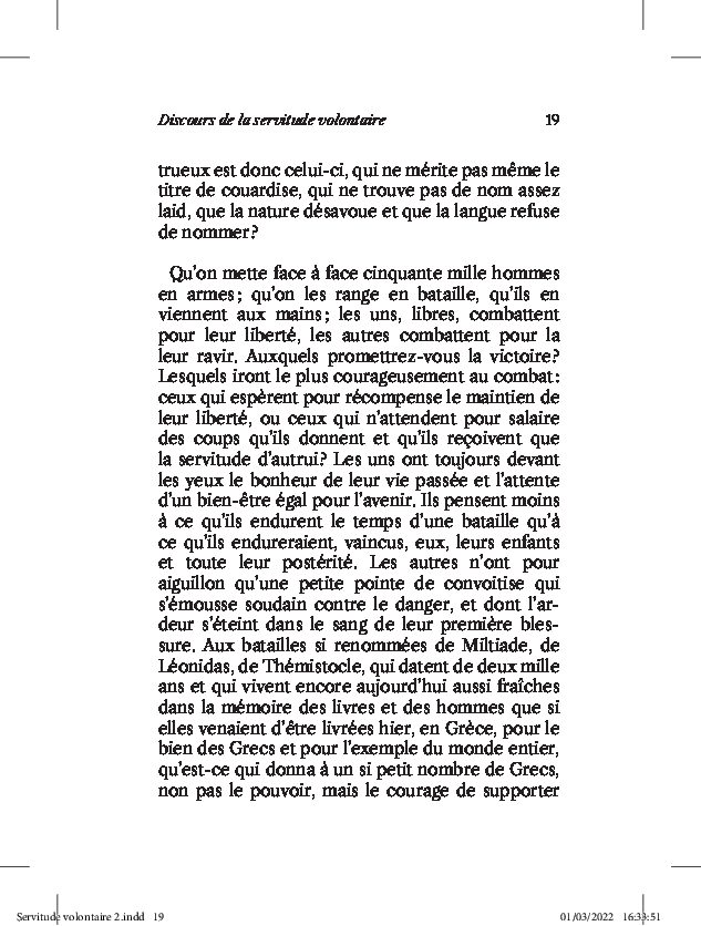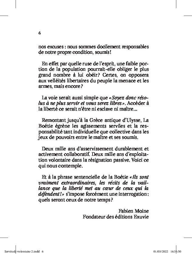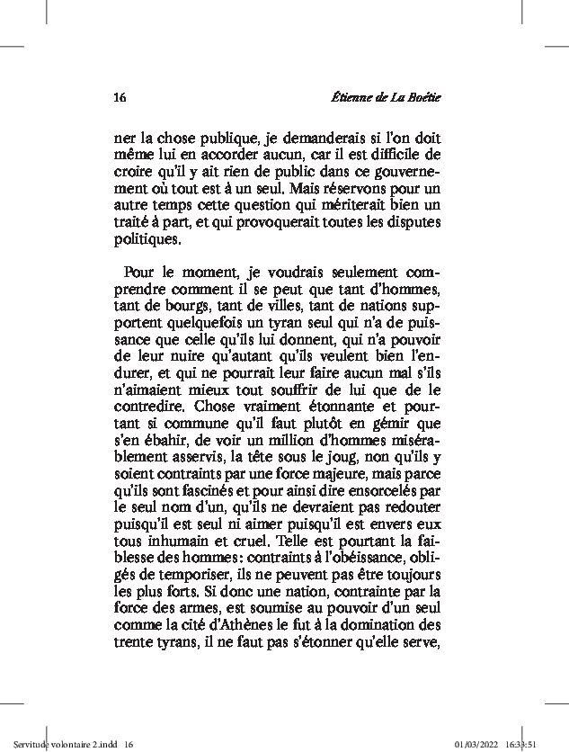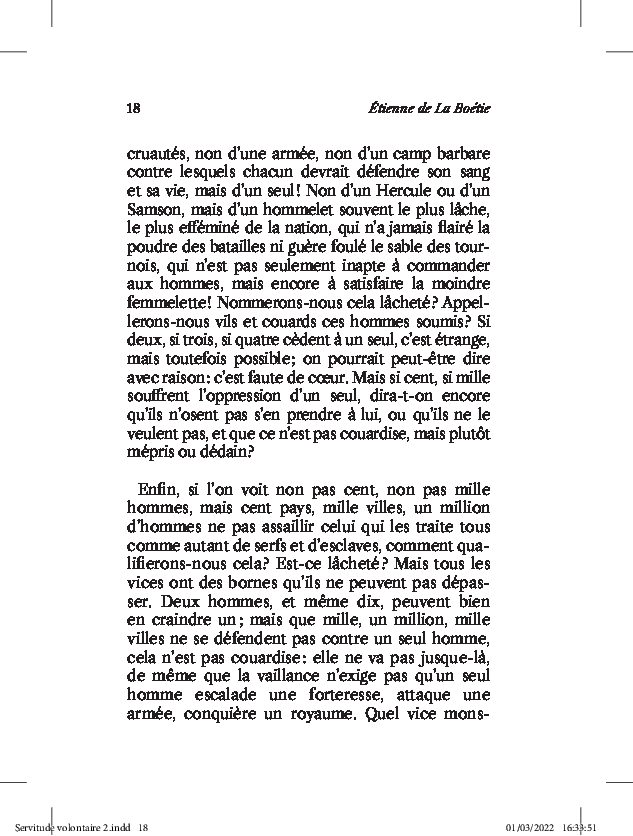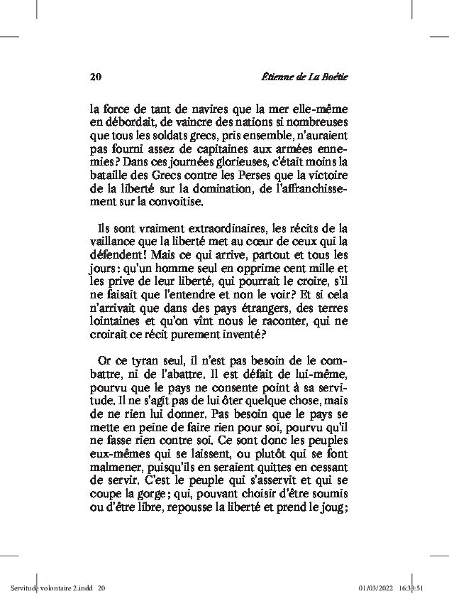 Il y a près de cinq siècles, la grande originalité de La Boétie est de pointer vigoureusement le fait que, contrairement à ce qu’on pourrait croire de prime abord, la servitude n’est pas forcée… mais qu’elle serait davantage et intégralement volontaire. Selon l’auteur, toute forme de pouvoir, quand bien même il se serait imposé par la force et la violence, ne peut véritablement dominer sans un peuple collaborant activement ou passivement. Le nombre se trouvant du côté de ce dernier, c’est donc à lui que revient la responsabilité de cet état de soumission et de servitude.