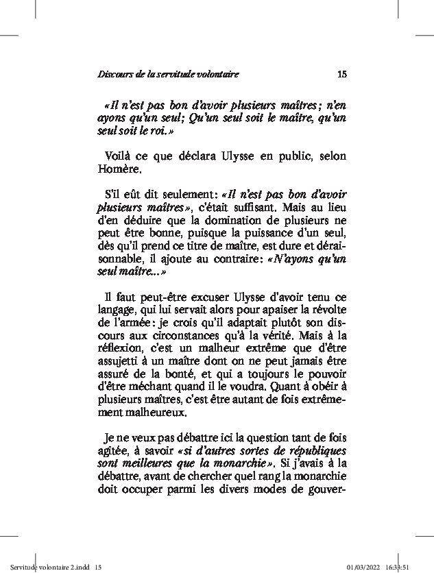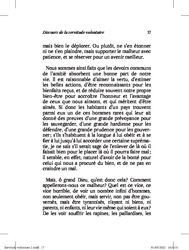 Il est à souligner que si ce concept a su passer les âges, Etienne de La Boétie a développé ici une approche absolument originale en pleine Renaissance. L’engagement du texte et la notion de désobéissance civile deux cents ans avant la révolution font de cet ouvrage un joyau de la Littérature française.