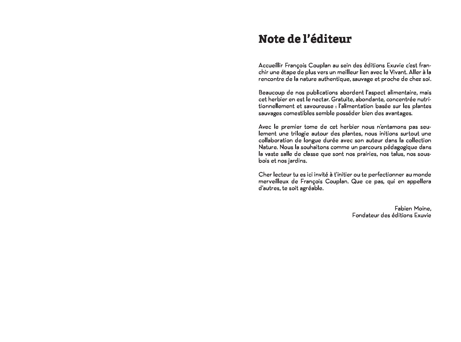 CRESSON ORIGAN COQUELICOT PLANTAIN PIMPRENELLE PRIMEVÈRE PRUNELLIER CHÊNE RADIS RAVENELLE ROBINIER ÉGLANTIER RONCE FRAMBOISIER OSEILLE DES PRÉS RUMEX CRÉPU SUREAU SILÈNE ENFLÉ SISYMBRE LAITERON STELLAIRE CONSOUDE PISSENLIT TILLEUL TRÈFLE MÉLILOT TUSSILAGE NOMBRIL-DE-VÉNUS ORTIE MYRTILLIER VIOLETTE INDEX DES NOMS LATINS INDEX DES NOMS FRANÇAIS INDEX DES RECETTES GLOSSAIRE BIBLIOGRAPHIE ABRÉGÉE DE FRANÇOIS COUPLAN |