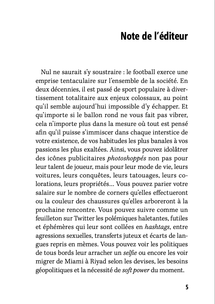 Sport le plus médiatisé au monde, le football est devenu un enjeu de pouvoir et de puissance incomparable. Acteur de la mondialisation, le ballon rond accompagne la vie quotidienne de milliards de personnes à travers le globe, ainsi que des chefs d’État paradant aux côtés du président de la FIFA lors des sommets internationaux.