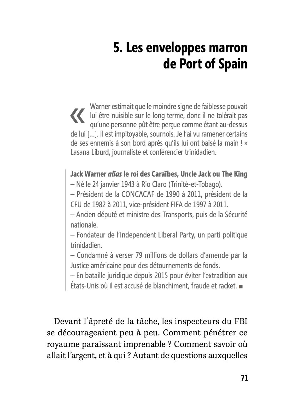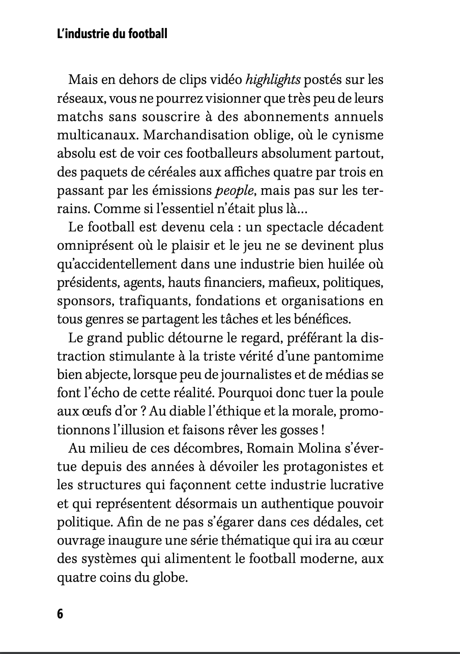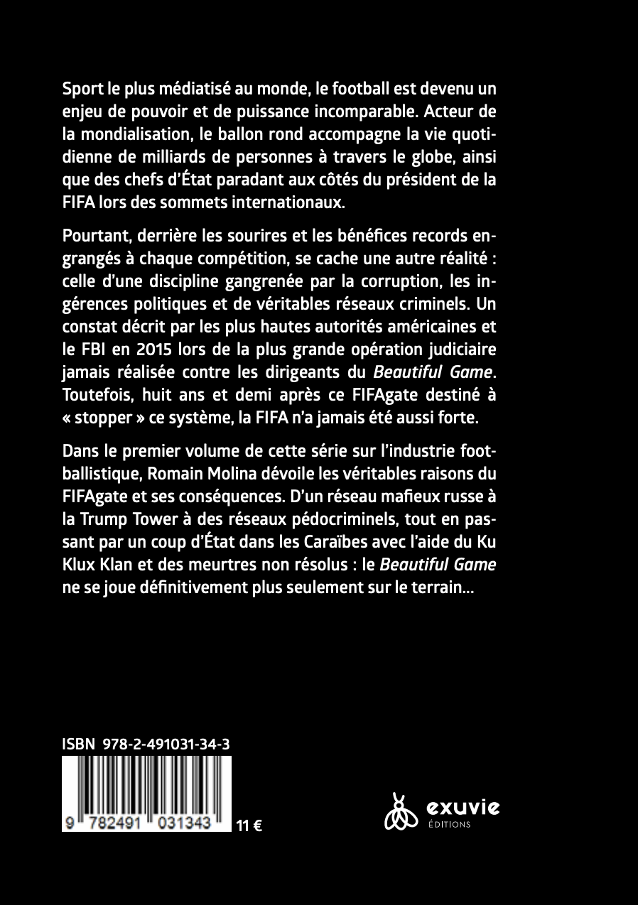 Dans le premier volume de cette série sur l’industrie footballistique, Romain Molina dévoile les véritables raisons du FIFAgate et ses conséquences. D’un réseau mafieux russe à la Trump Tower à des réseaux pédocriminels, tout en passant par un coup d’État dans les Caraïbes avec l’aide du Ku Klux Klan et des meurtres non résolus : le Beautiful Game ne se joue définitivement plus seulement sur le terrain…